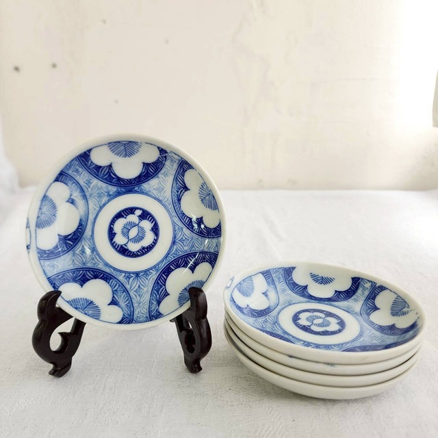 昭和初期 4寸印判皿 縁起物 鶴松5枚組 b