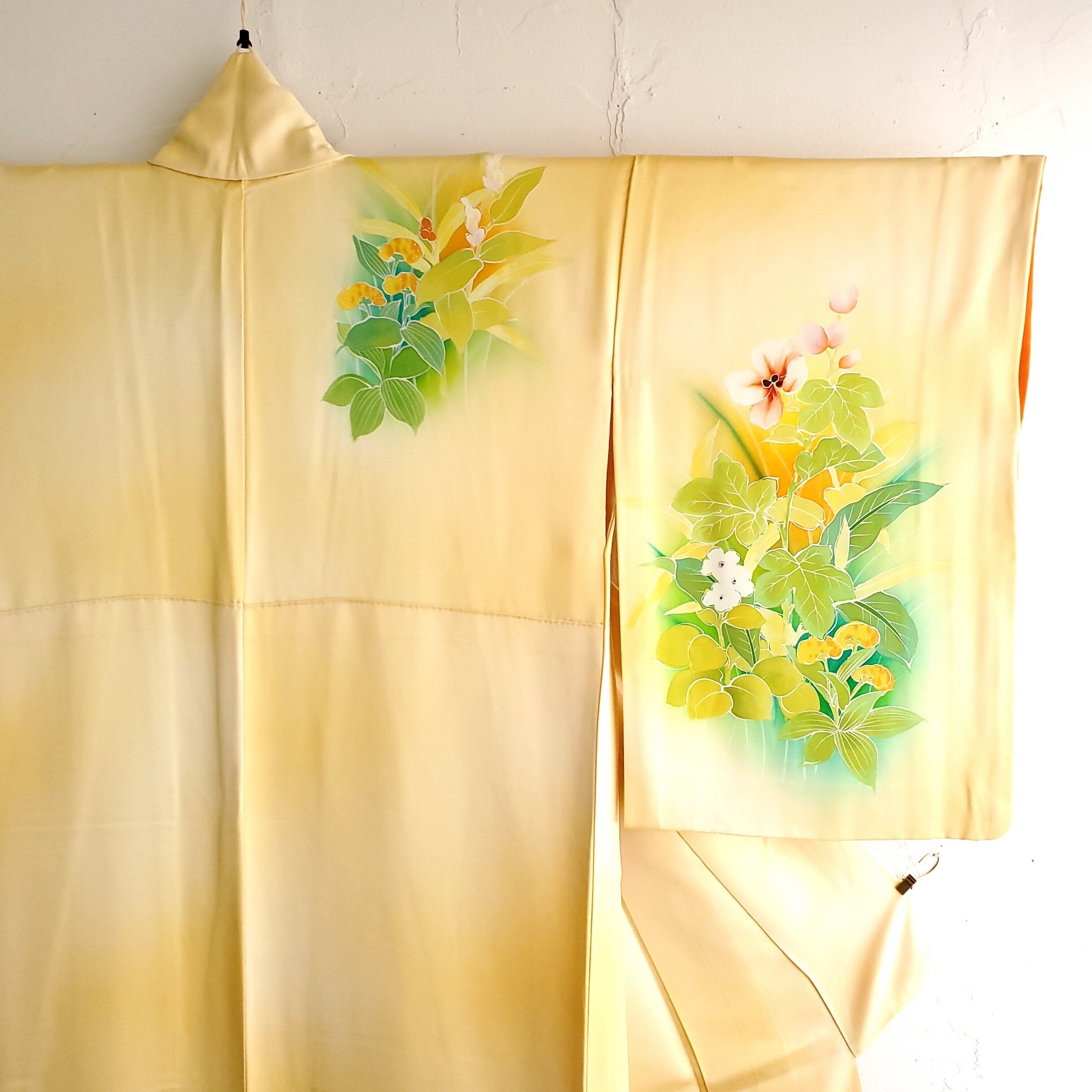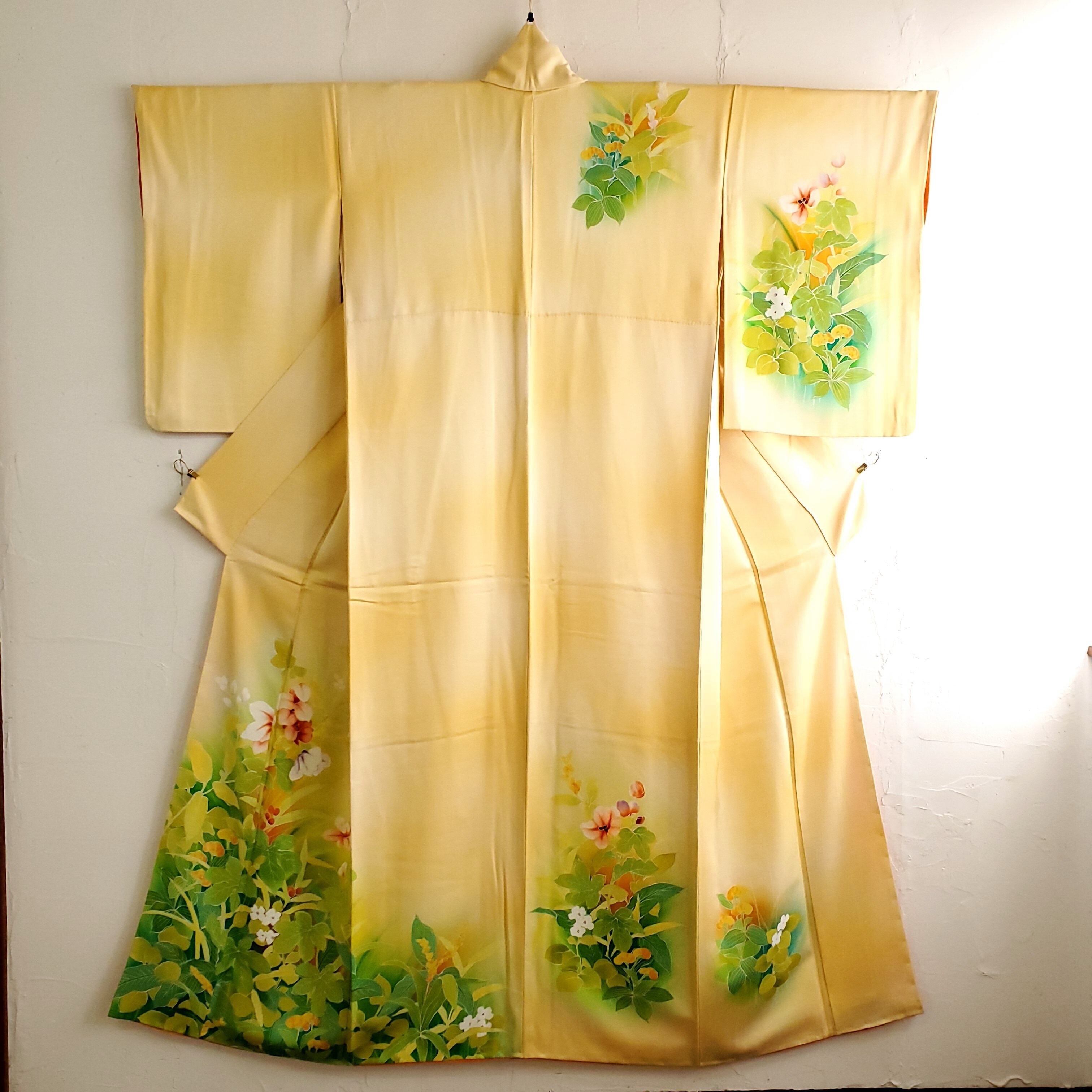 柔らかい黄色味に草花が咲き誇り、草花のかぐわしい香りが、今にも漂ってきそうなお着物です。