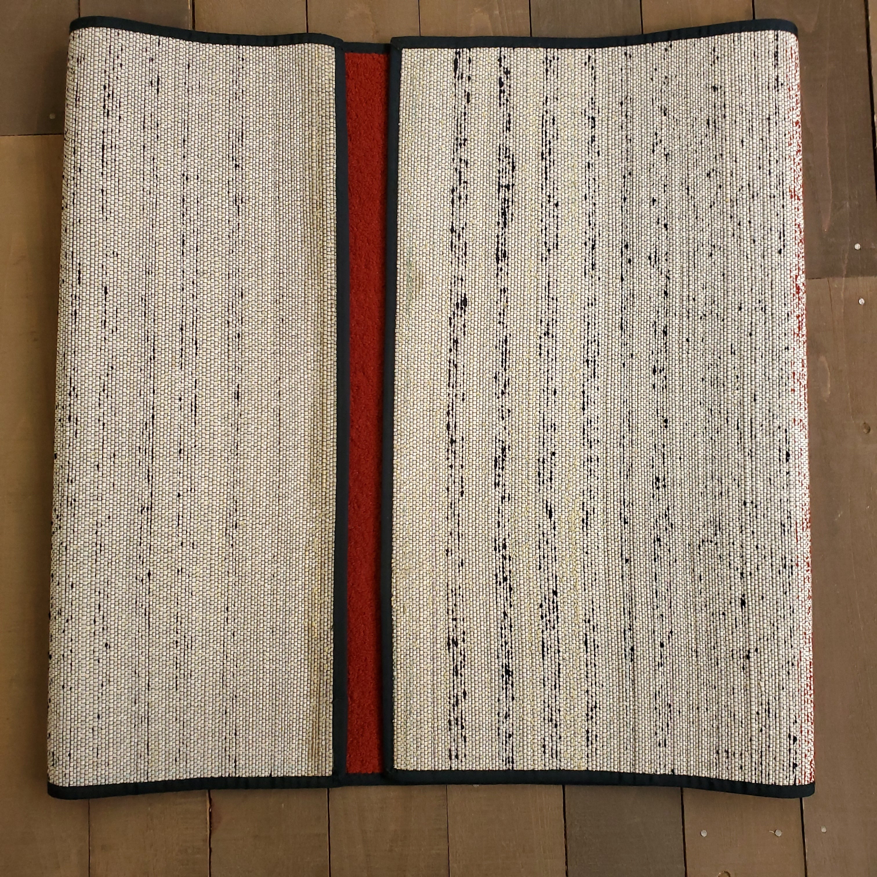倉敷緞通は、2人がかりで息を合わせ組み上げて織り、イ草・和紙・綿糸、この3つの植物系の天然素材を用いることで、蒸れにくく埃も立ちにくいのが最大の特徴です。