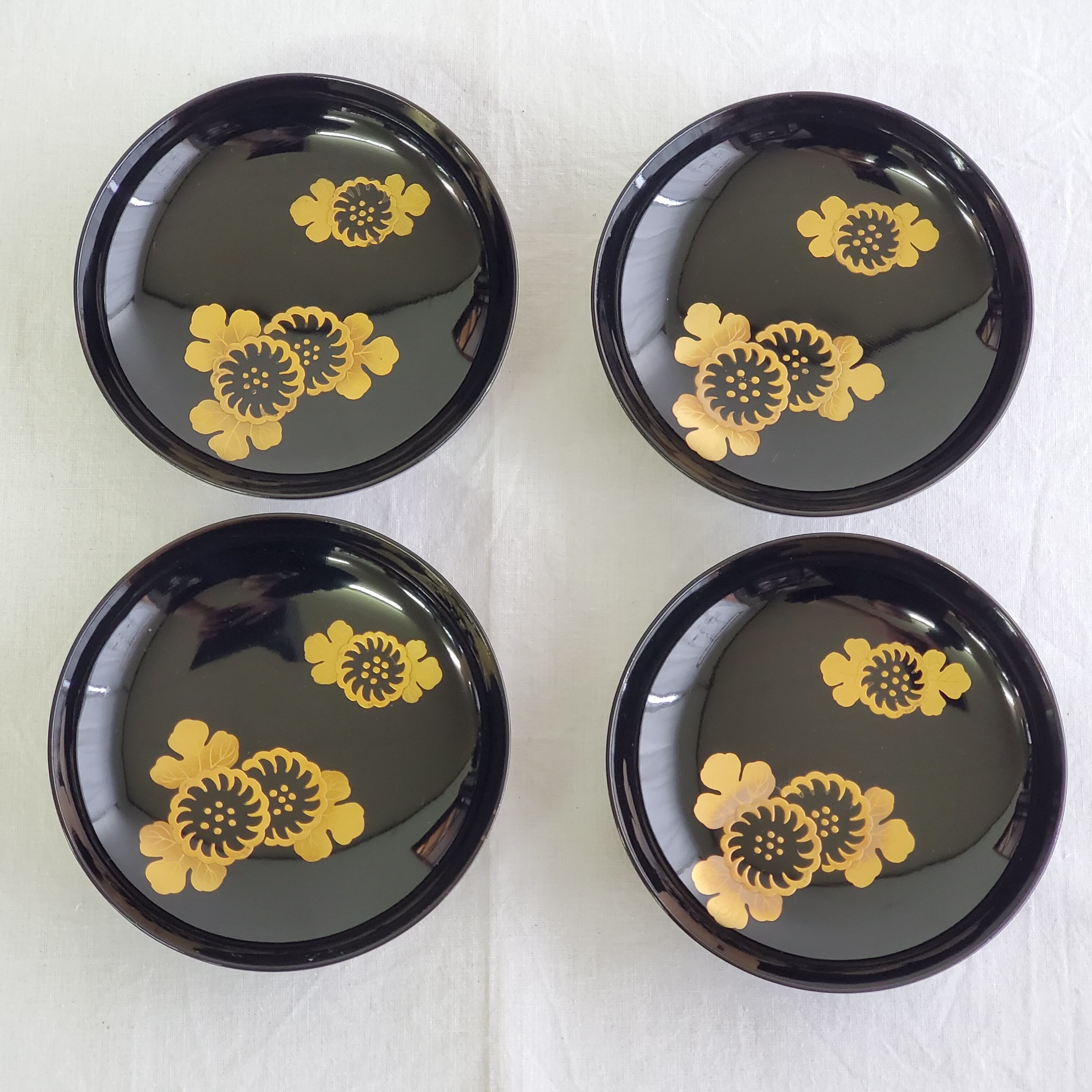 大正から昭和初期の黒漆 蝶菊文 金蒔絵 4客になります。