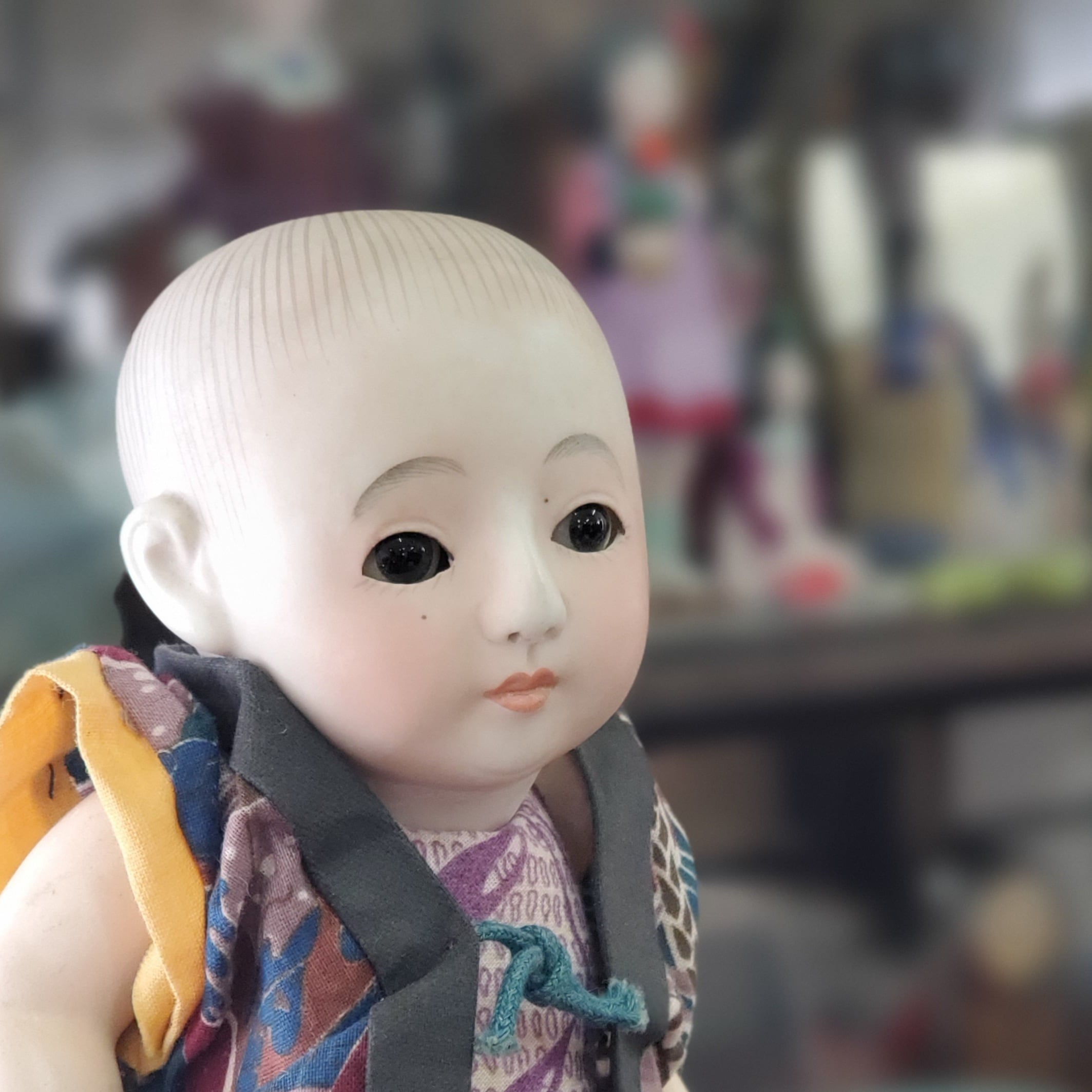 腹掛けにちゃんちゃんこ姿が可愛く、優しい表情とどことなく品のあるお顔立ちのビスクドールです。
