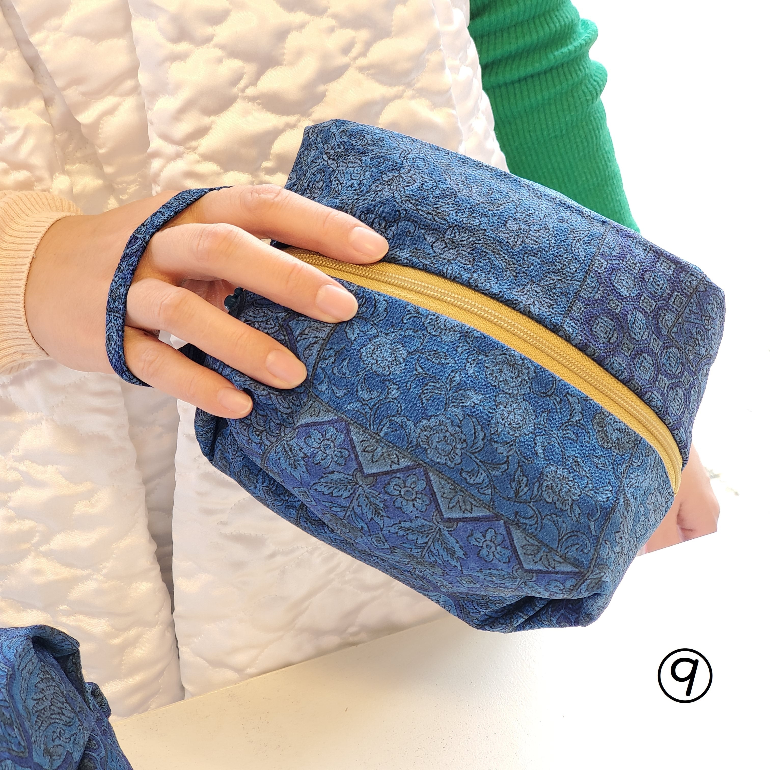 今は着なくなってしまった羽織りでアップサイクルしたhexagon型(六角形)の立 体感あるポーチです。