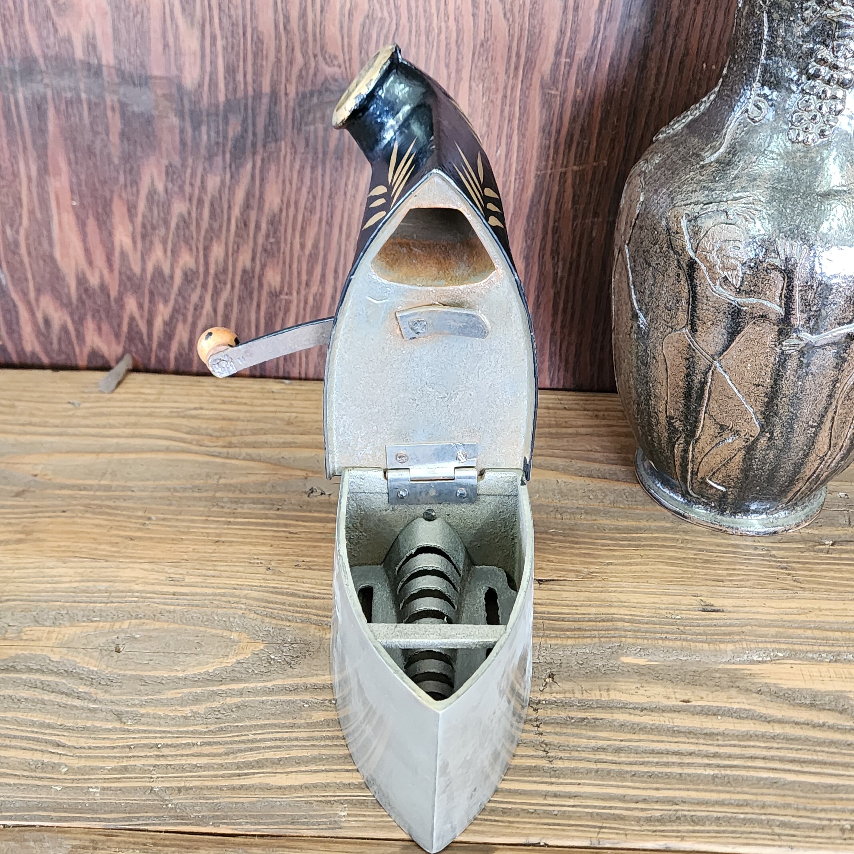 中に火のついた炭を入れて底面を熱し、その熱と本体の重さで布のしわを伸ばす、電気のない時代に使われていた道具です。