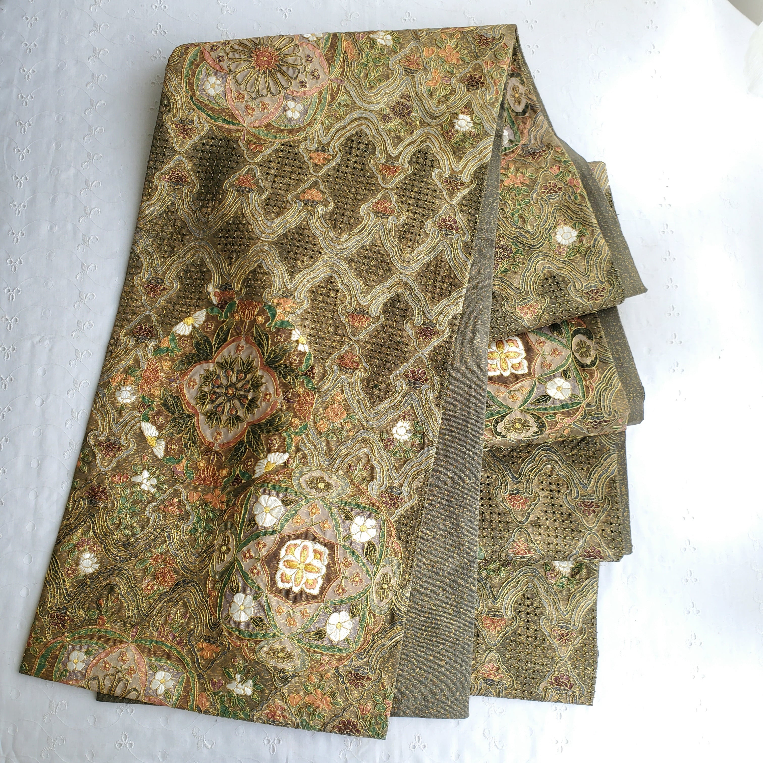 複雑に織りあっているため、何色ともいえない何とも言えない地色をしていて、見る人に豪華さを感じさせ女性ならではの気品豊かな逸品です。