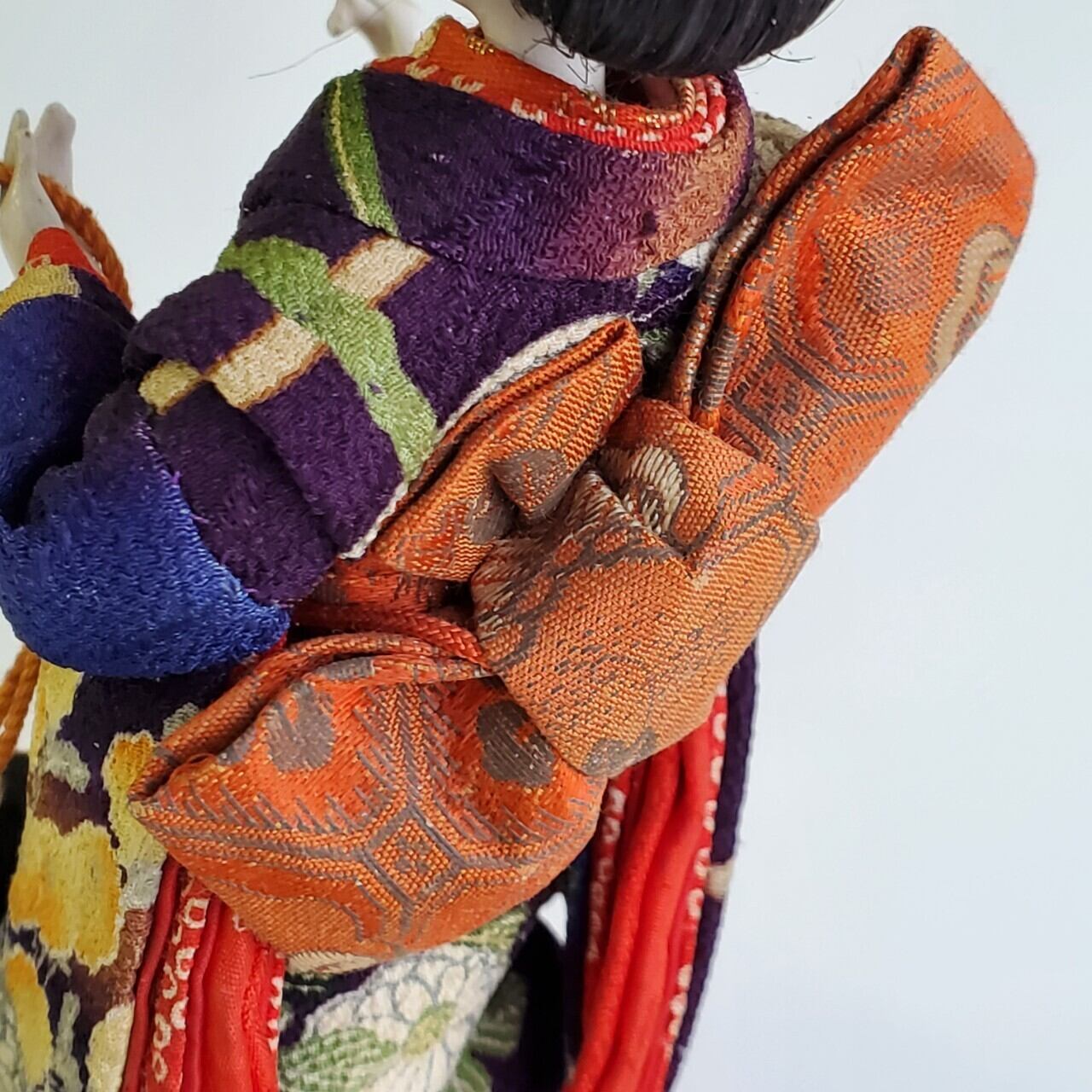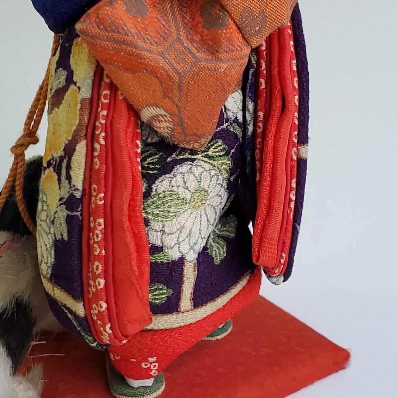 縮緬の振袖を着た犬を連れているじょでい人形です。